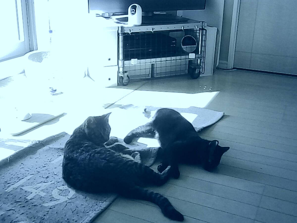 白黒以外にもフィルターやフレームがいくつか用意されてるので、ぜひそれで遊ぶべし。クールトーンフィルターなんかはレトロ感がいい感じだ。うちの兄妹猫がもつれあって遊んでたのでクールトーンで。青っぽいうえに、陽射しが当たってるところが白トビしててそれがまた余計にレトロ感を増してくれる。
