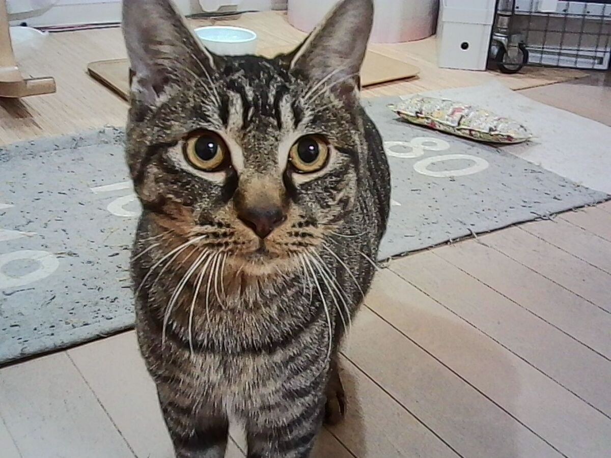 普通に撮るとこう。その指で持ってるものはなんだ? もしかしておれのおやつか? って顔で近づいてきたところを狙ってみた。