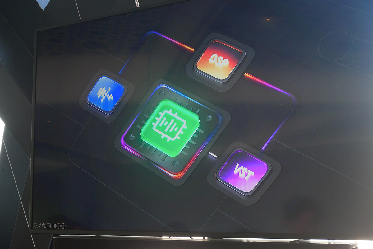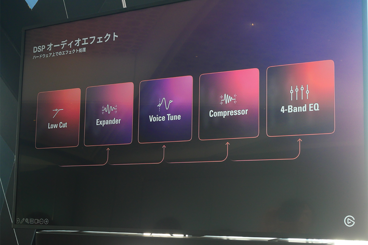 DSPは、5つのオンボードDSPエフェクトからなる。エアコンや足音などの低周波ノイズを取り除く「ローカット」、話してないときだけ環境音などの雑音を自然に低減する「エキスパンダー」、音量の波を均一に整えて、安定したサウンドを実現する「コンプレッサー」、最終的な声のトーンを微調整する「バンド イコライザー」。