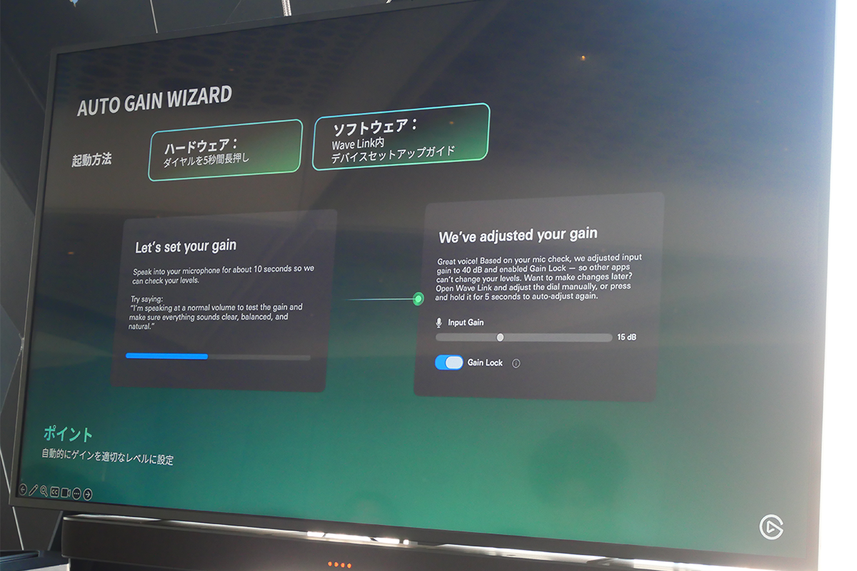 WAVE NEXTのハードウェアでより簡単に質の高い声を出す機能として「AUTO GAIN WIZARD」も用意されている。これは、例えば新たに登場した「Wave:3 MK.2」の場合、ボタンを長押しして起動し、10秒程度話すことで自動的にゲイン(入力レベル)を最適値に設定してくれるという機能だ。どれくらいの音量が最適かというのは、慣れていないとなかなか最適なゲインに設定できないと思うので、こちらもとく初心者にとってはうれしい機能だろう。