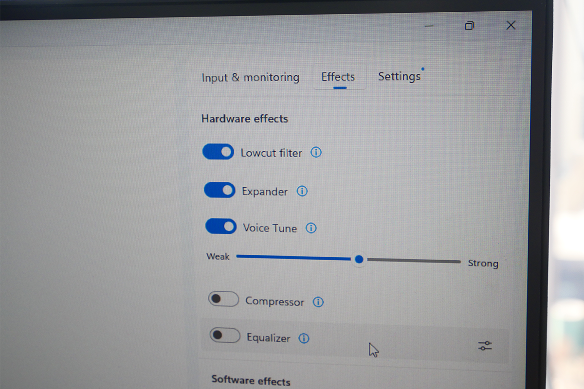 そして、アナログテープレコーダーのような、温かみのあるボイスにすることができるエフェクト機能「VOICE TUNE」の計5つだ。VOICE TUNEは、ソフトウェアに表示されたスライダーを表示することで、エフェクトの強弱を設定できる。