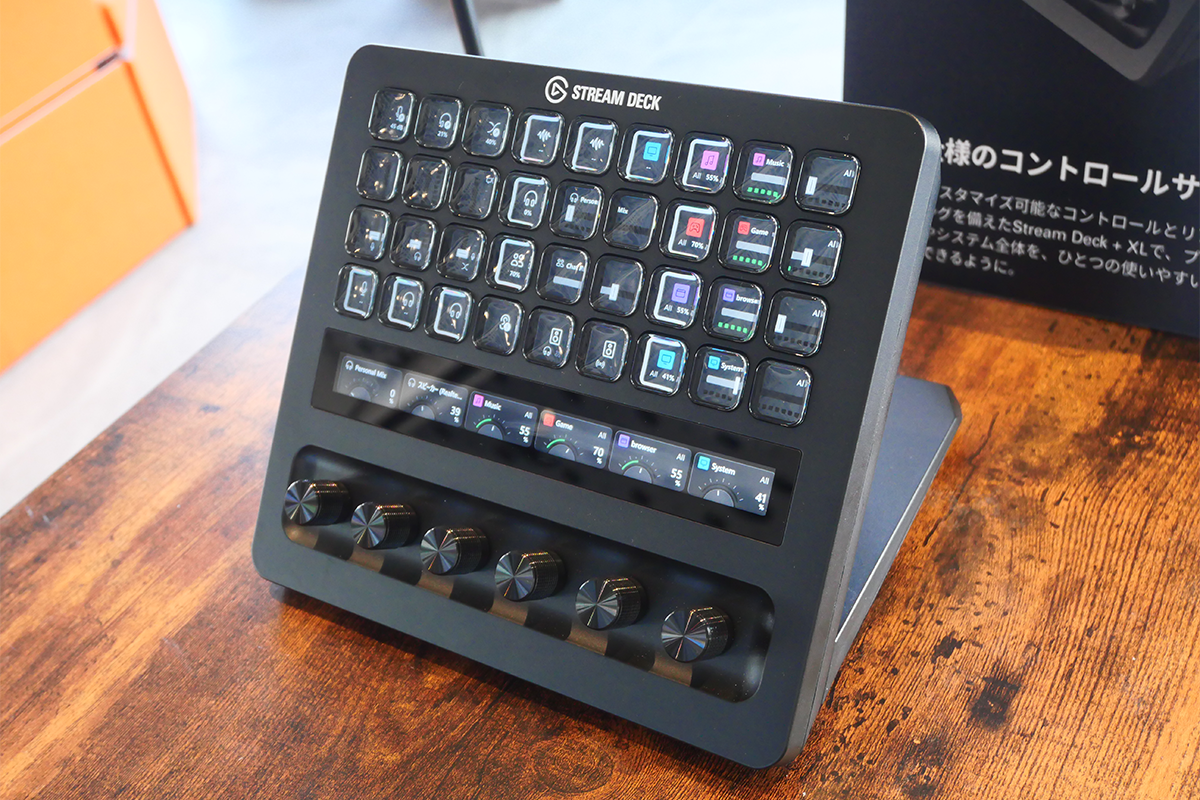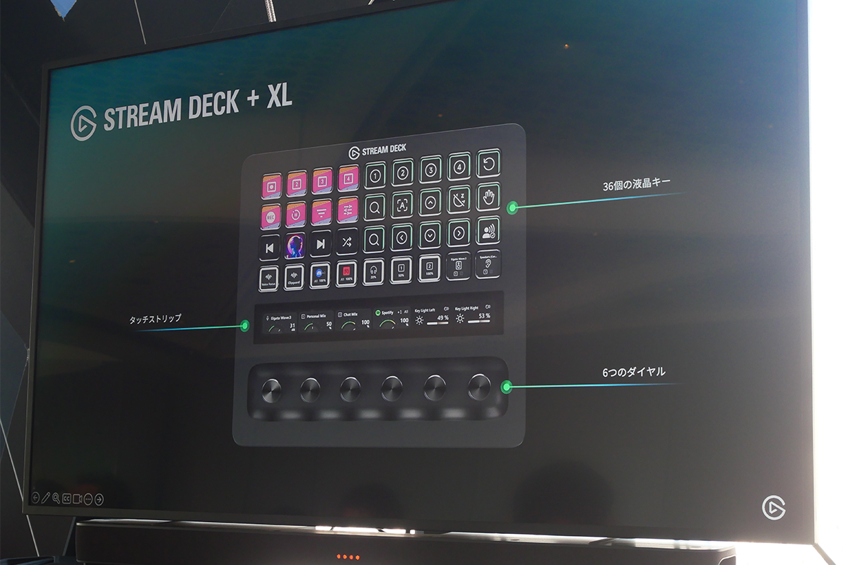 「Stream Deck + XL」は、Stream Deck +を大型化したモデルで、ボタン数は36個、ダイヤル数は6個に増加している。ダイヤルの上にはタッチストリップがあり、スワイプ操作での機能切り替えや、情報表示に対応している。3月13日に発売予定で、価格は5万9980円。