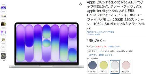発売されたばかりのMacが、すでに安く買える状況になっている。Appleの新型ノートPC「MacBook Neo」は3月11日に登場したばかりのモデルだが、Amazonでは95,768円で販売中。Apple公式サイトの販売価格99,800円よりも安い実売価格となっている。