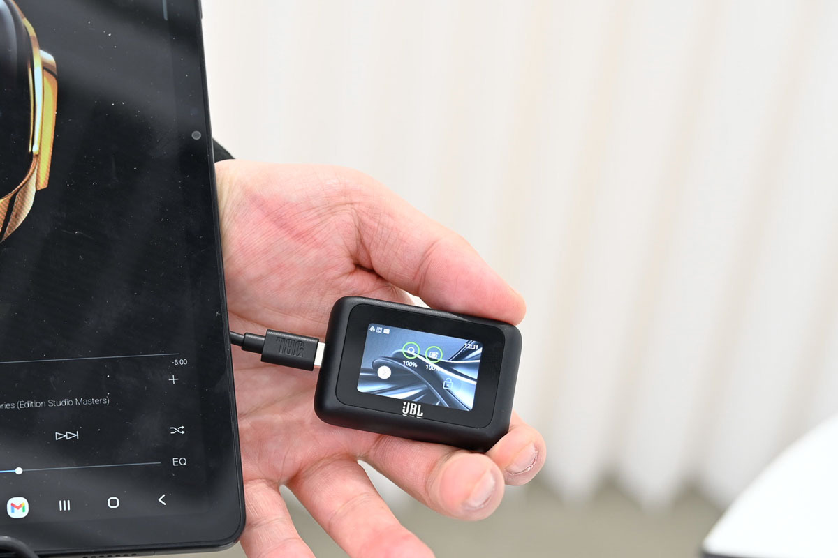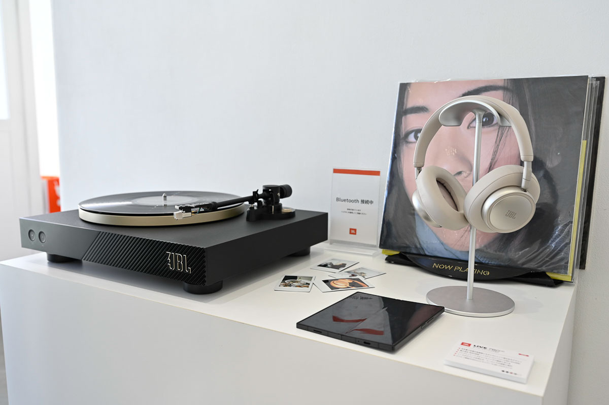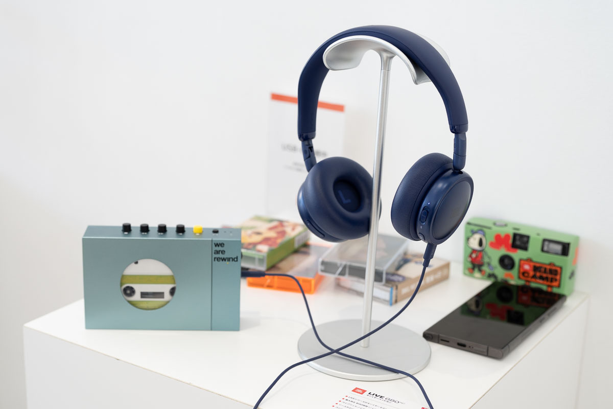 オーディオ機器としての基本性能も、もちろん一級品である。両モデルともに40mm径のダイナミックドライバーを搭載。会場では、Bluetooth送信機能を備えたアナログレコードプレーヤーやカセットテーププレーヤーを用いたユニークな試聴デモが行われていたが、アナログ特有の温かみのある音源と、低音がしっかりと響き渡る生き生きとした「JBLシグネチャーサウンド」の相性は抜群であった。もちろん、最新の空間オーディオ機能にも対応しており、高い没入感を味わうことができる。