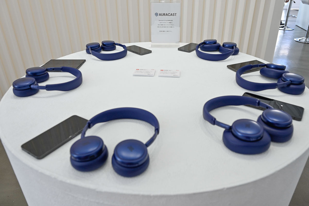 さらに会場のデモ体験コーナーで強いインパクトを残したのが「Auracast」の実機デモだ。Auracastとは、1つの送信機(スマートフォンや専用トランスミッター)から、対応する複数のヘッドホンやイヤホンへ同時に同じ音源をブロードキャスト配信できる次世代機能である。