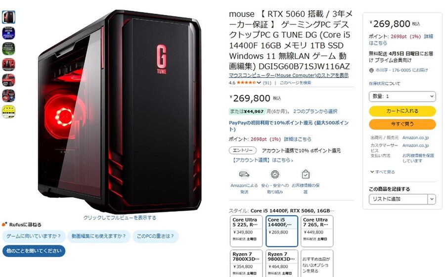 Amazon.co.jpにて、マウスコンピューターのゲーミングPC「G TUNE DG(RTX 5060)」が販売中だ。価格は26万9800円。