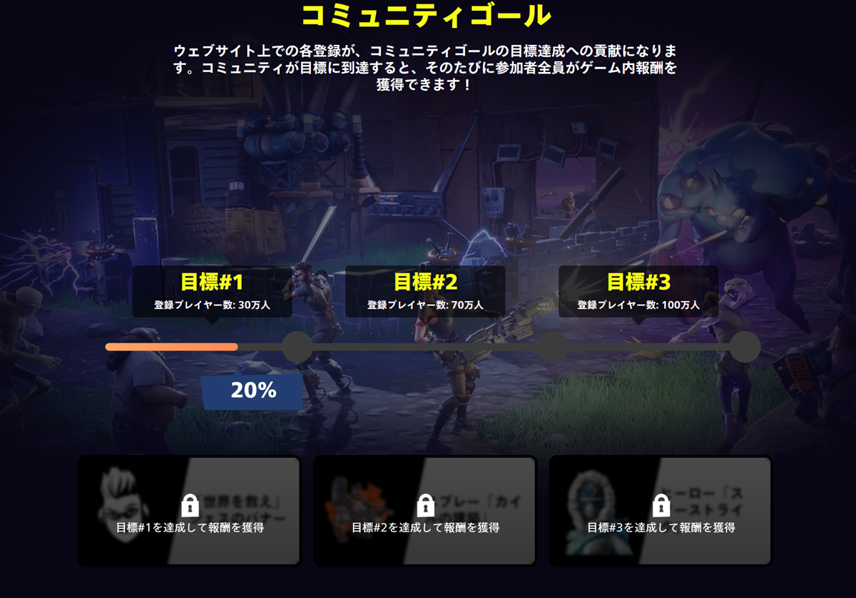 さらに、専用ページで“事前登録”も行なっている。Epic Gamesアカウントでログインするだけで登録完了となり、現在は約20万人が登録。これが100万人に到達すると、ヒーロー「スノーストライク」が解放されるという。