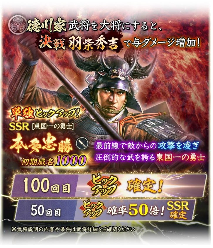 ■初期威名1000のSSR【東国一の勇士】本多忠勝が単独ピックアップ! 「将星特別登用・本多忠勝 ‘26春」開催!