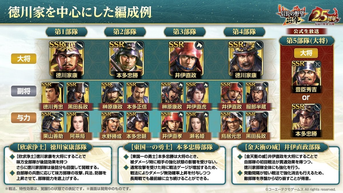 このほか、共闘イベントへの参加に必要な「討伐札 第25期」などを獲得できるイベントログインボーナスや、「将星特別登用札・本多忠勝 ‘26春」や「恩賞朱印状 第25期」「軍略図 第25期」などの入った各種「共闘パック」の販売も行っている。詳細はゲーム内お知らせを確認してほしい。