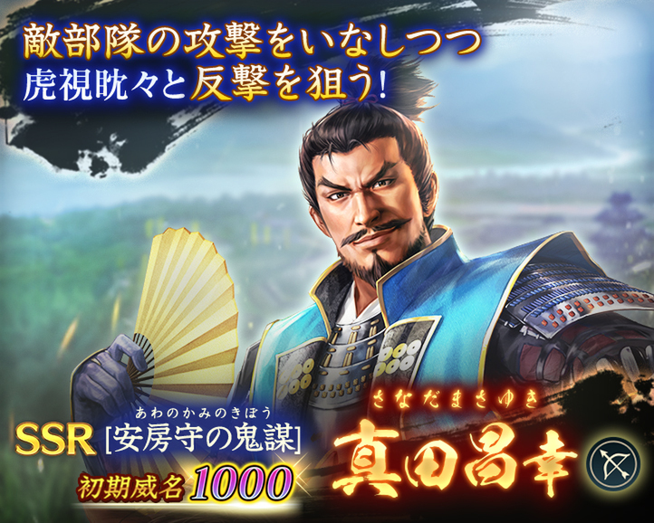 「立身将星登用・真田」を開催。初期威名1000のSSR【安房守の鬼謀】真田昌幸、同じく初期威名1000のSSR【六文銭の誓い】真田幸村からピックアップ武将を1名選択できる。