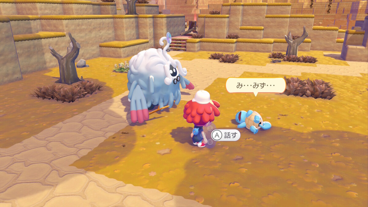 ●「パサパサこうやの街」のおねがいごと「すみかを作ってあげよう!」で、「ゼニガメ」が木の上に移動して話しかけられず、おねがいごとが進められない。