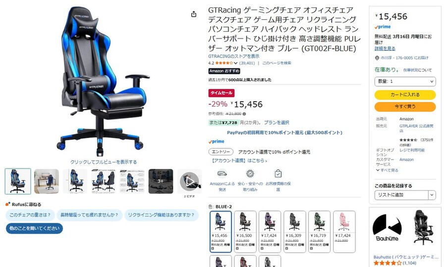 Amazon.co.jpにて、GTRacingのゲーミングチェア「GT002F-BLUE」が販売中だ。参考価格は2万1800円だが、タイムセールにより29%オフの1万5456円で購入できる(3月13日時点)。