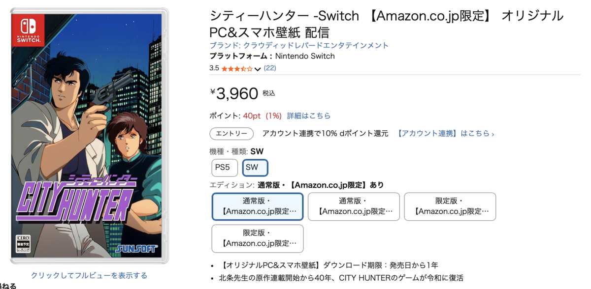 さて、今回紹介するのは「シティーハンター -Switch」です。そう、「シティーハンター」もゲームになっているんですね。Amazonでは3,960円で購入できます。