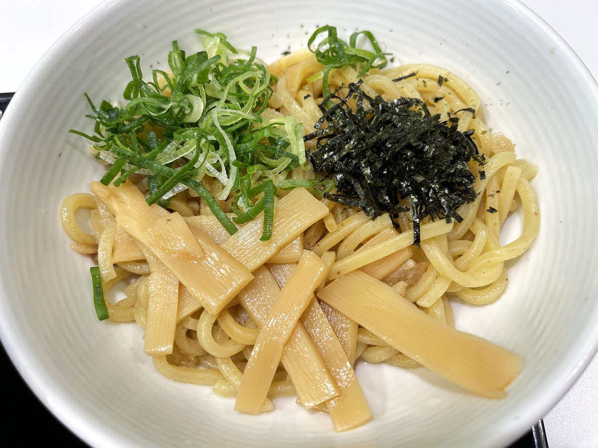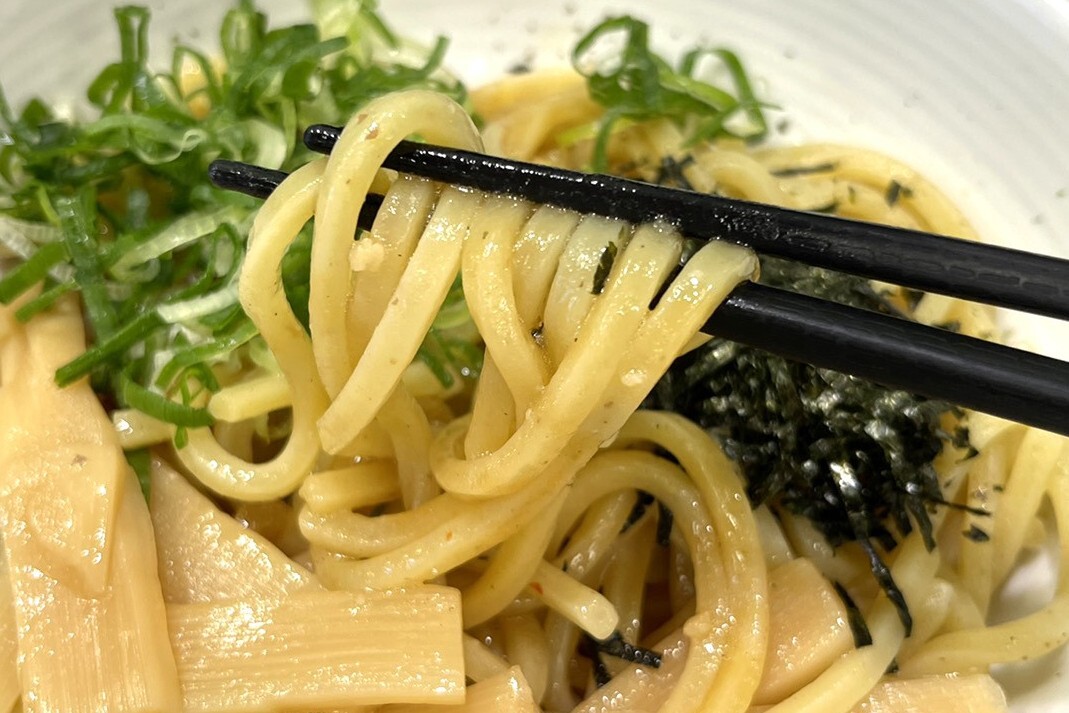 メンマ、のり、青ねぎがトッピングされたシンプルな見た目。リリースによると、麺には背脂とラードをのせ、にんにく・醤油・胡椒が効いたたれを絡めているそうです。