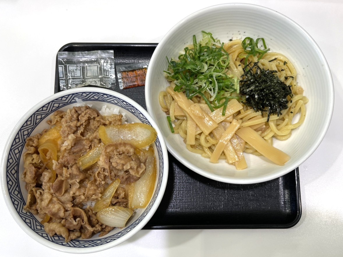 おそらく、麺メニューをどう生かすか試行錯誤した結果、たどり着いたひとつの形が「牛丼の補佐役」という立ち位置なのでしょう。吉野家の看板メニューである牛丼とのバランスが、よく考えられていますね。