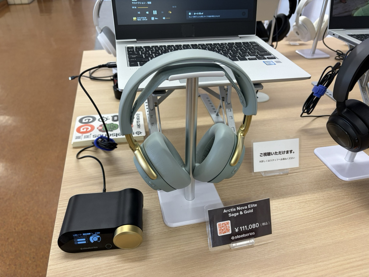 ブースでは、Arctis Nova 7 Gen 2以外のデバイスも視聴することができます。要注目なのが、「Arctis Nova Elite」。こちらは96kHz/24ビット、ハイレゾ・ワイヤレス・オーディオに対応するハイエンドヘッドセットです。お値段なんと11万1080円。