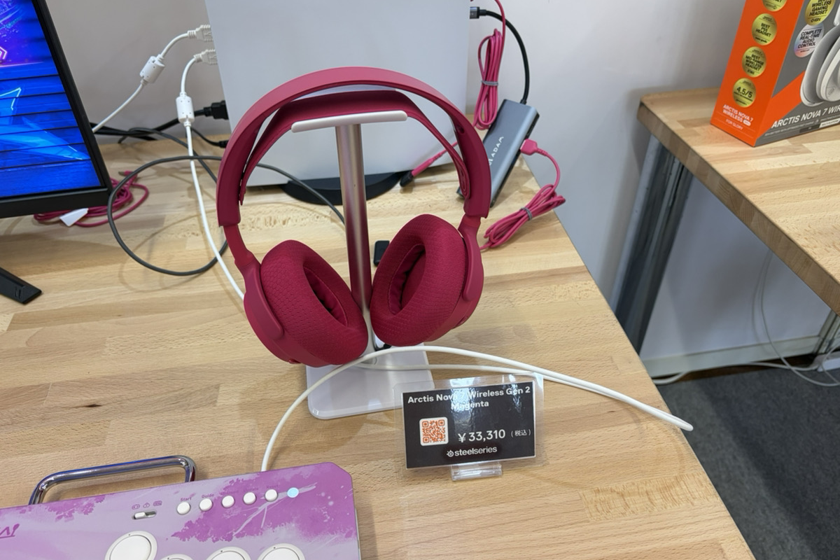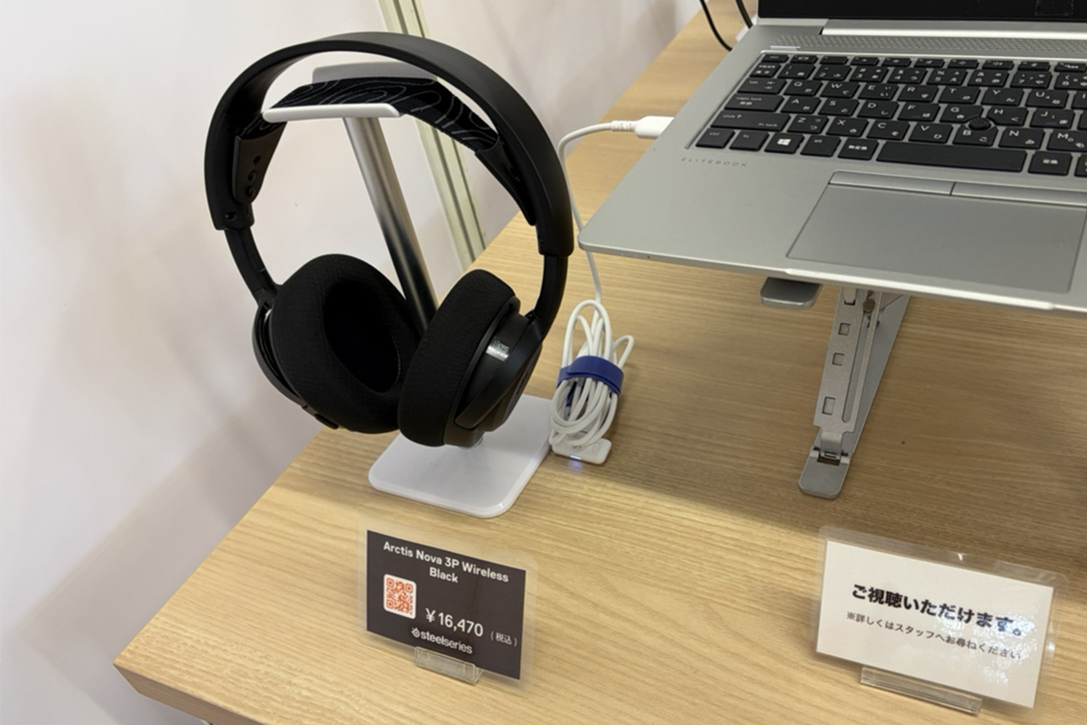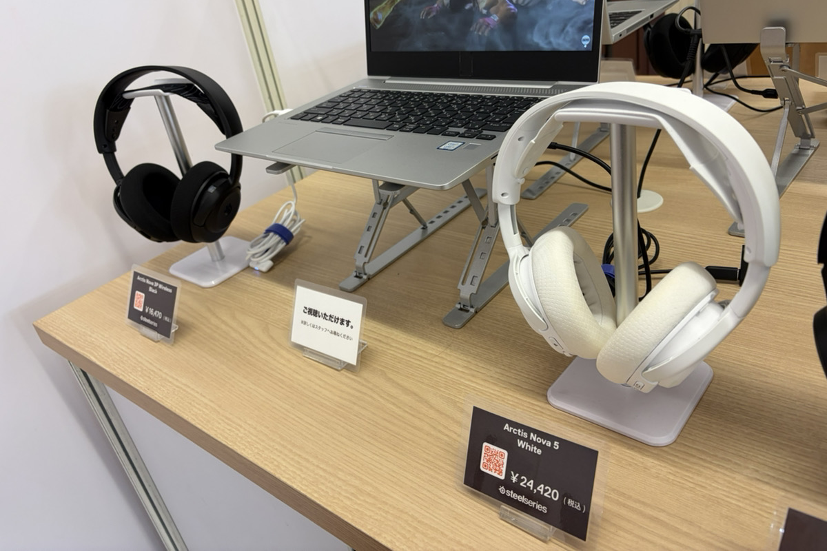 そのほかの製品群もズラリと並んでおり、すべて音を試すことができます。担当者によると、Arctis Nova 7 Gen 2以外以外で人気なのが「Arctice Nova 3P Wireless」で、「Arctice Nova 5」とほぼ性能が同じで、差はマイク内蔵かそうでないかくらいとのこと。Arctice Nova 3P Wirelessの価格は1万6470円と比較的リーズナブルなこともあり、売れ筋の製品だそうです。