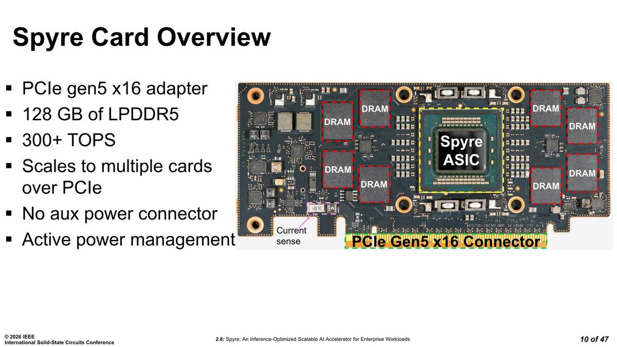 Spyreを搭載したカードの構造が下の画像だ。前掲のカード画像と見比べるとかなり似ているのがわかる。ただ、若干部品配置が異なるものもあるので、厳密に一緒というわけではない。