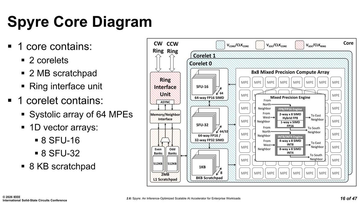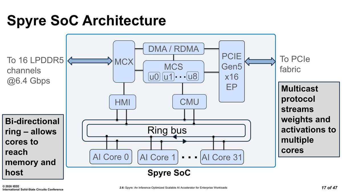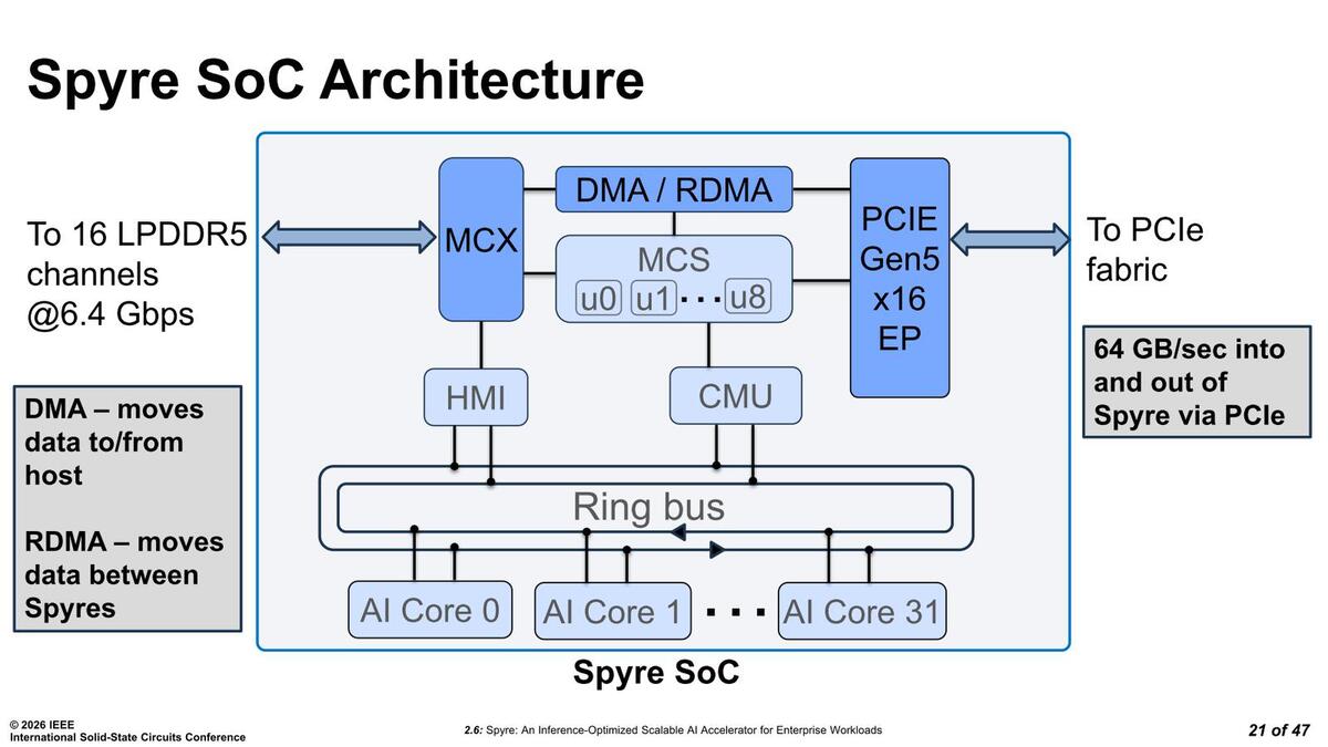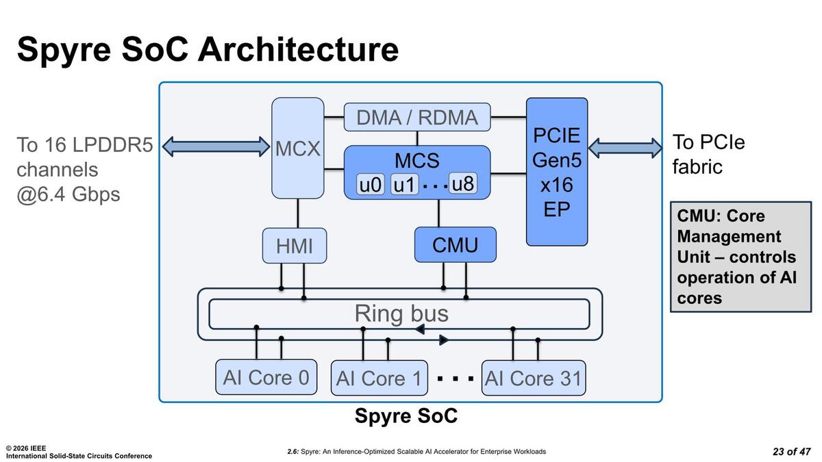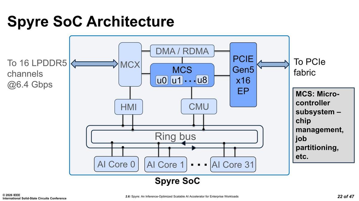 こうした制御を行なうために通常ではアプリケーションプロセッサーがいくつか搭載されそうなものだが、SpyreではMCUが8つ実装されたMCSが搭載されているそうだ。