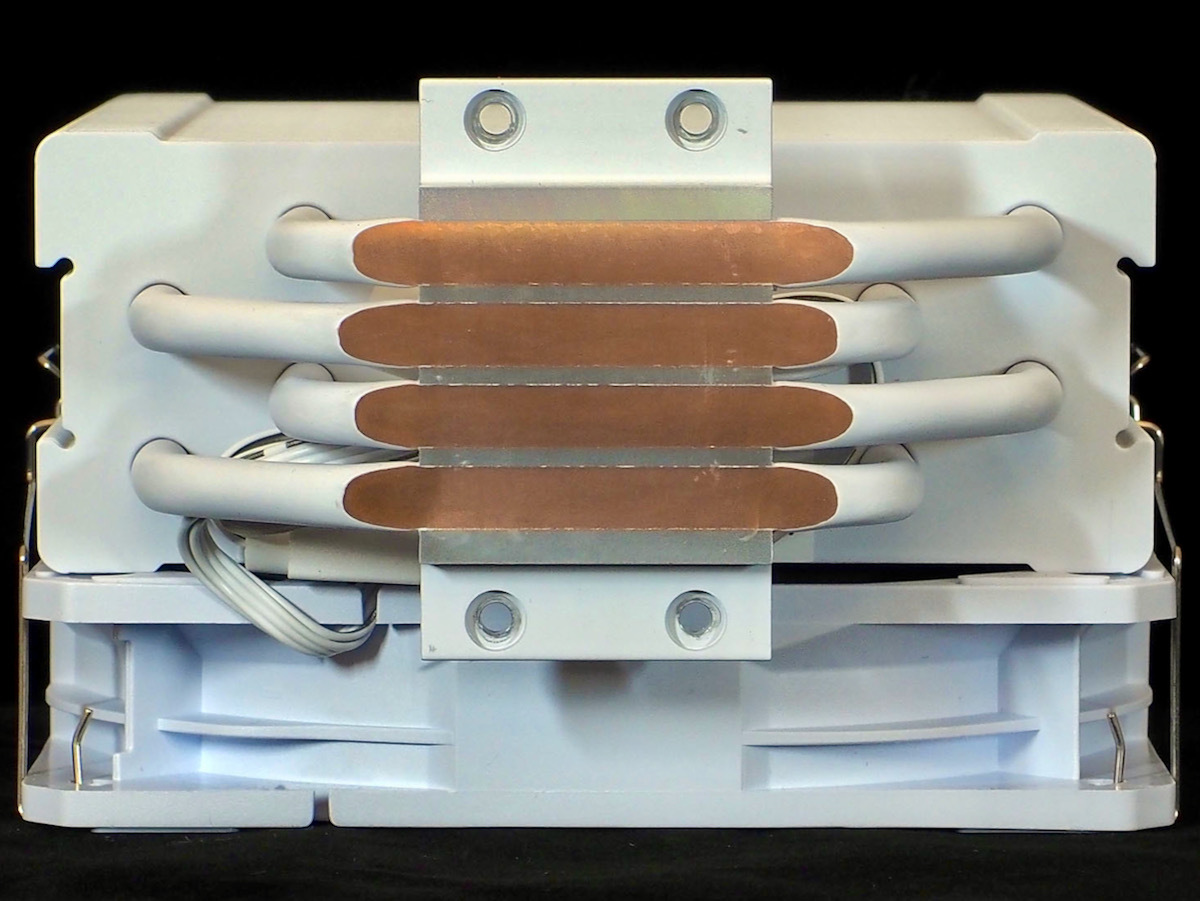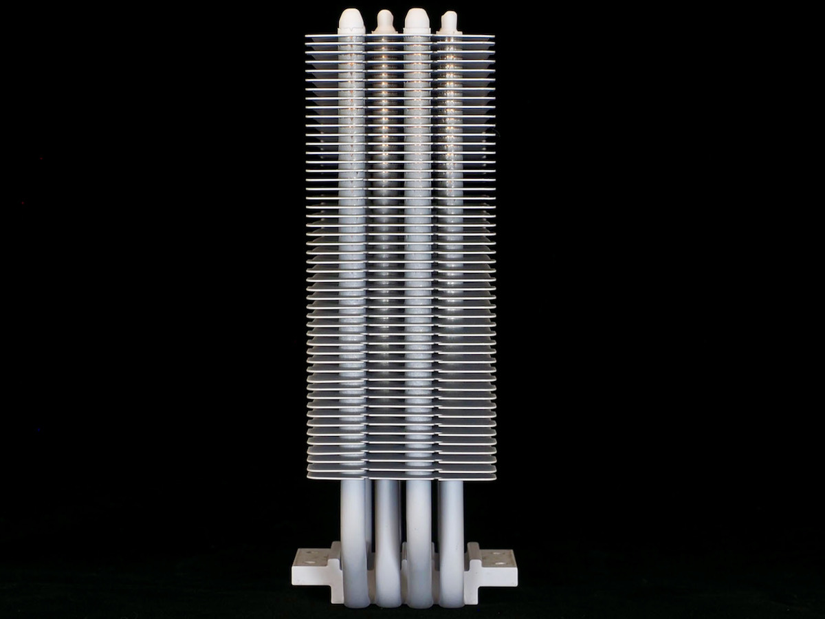 MAG COREFROZR AA13 WHITEのヒートシンクサイズは121×152×94.5(W×H×D)mm。シングルタワーの定番モデルと比べると、幅は若干小さめ、高さは同じくらい、奥行きが若干長めといったあたりになる。4本のヒートパイプは2本が中央寄り、もう2本が外寄りになるが、ケース前後方向の曲げはなくオフセットなし、ソケットに対して垂直に伸びている。パイプ径は6mmだ。見てのとおりヒートシンクやヒートパイプまでも白いため、ホワイトで統一したパーツで組み上げたPCにぴったりのカラーリングとなっている。