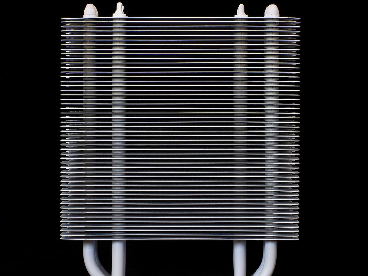 また、ベースプレートを見ると、4本のヒートパイプが露出したダイレクトタッチを採用、間隔を空けて通されている。ソケットの長辺に沿ってヒートパイプを通すシングルタワー型の場合、4本が一般的だ。ただしヒートパイプの通し方は各社設計思想が現れるところ。4本でも密着させているもの、MAG COREFROZR AA13 WHITEのように間隔を空けたものがある。ダイレクトタッチの場合は平滑度、つまり加工精度がポイントになるが、そこはGPUクーラーで実績のあるMSIである。指で触れても段差を感じることはなかった。