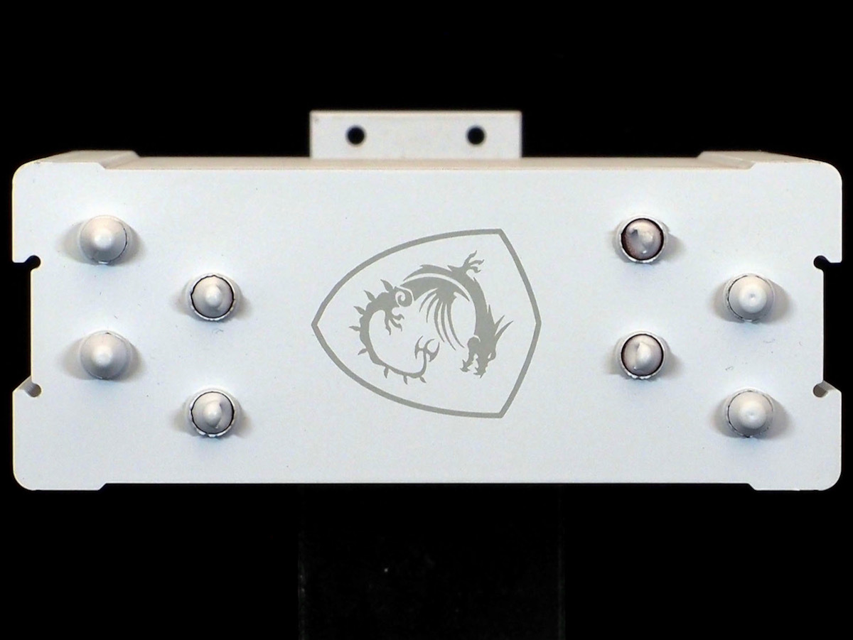 ヒートシンクのトップはシンプル。最上段にはトップカバーが設けられ、ヒートパイプの先端が突き抜けるデザイン。中央にはレーザー刻印によるドラゴンエンブレムがあしらわれている。ホワイトモデルの場合、ホワイト地にシルバーなので淡い印象だ。エンブレムがあるので、装着方向を間違えるということはないだろう。