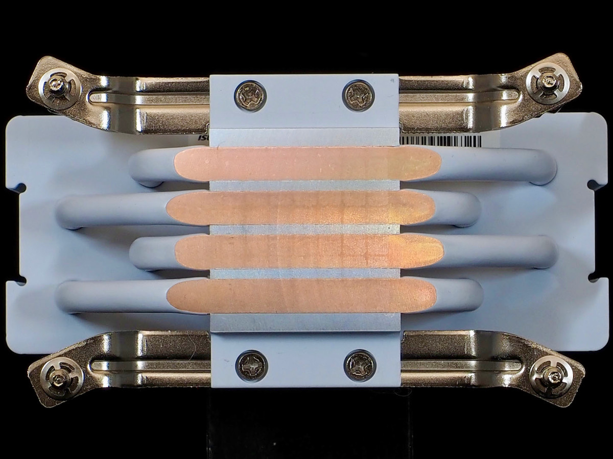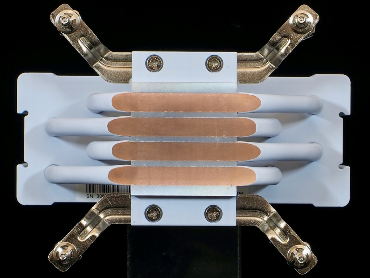 マウンティングバーは、Intel用とAMD用に分かれている。このマウンティングバーを付け替える場合は、ベースプレート側にある2本のボルトで取り外し交換する。ここも空冷CPUクーラーでは一般的な手法だ。また、バックプレートへの固定方法は昨今のトレンドとは異なる。マウンティングバー側に装着されているスクリューの先端はオス。バックプレート側はメスになっており、スペーサーなどは介さず直接ボルト締めをする。部品点数と工数が少ないのがメリットだ。