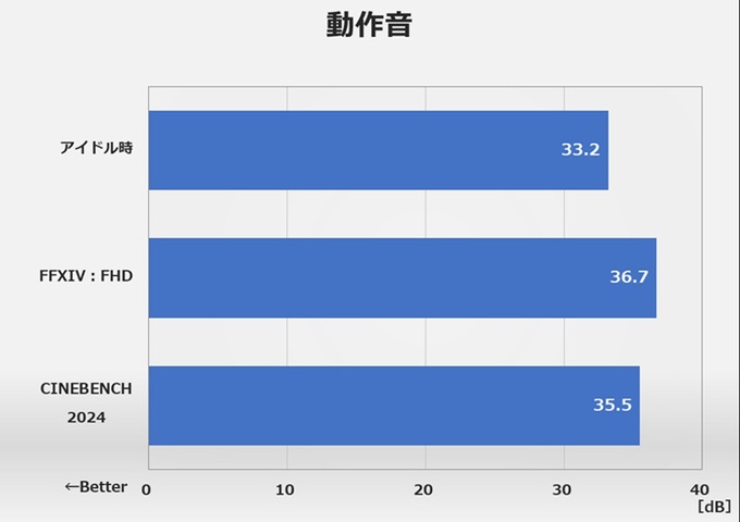 動作音値も紹介しておこう。まずアイドル時については33.2dBで、暗騒音の32dBからそれほど上昇していなかった。また、CINEBENCH 2024時は35.5dB、ファイナルファンタジーXIV: 黄金のレガシー ベンチマーク時は瞬間的だが36.7dBといった値だった。後者はゲームベンチマークなのでGPUクーラー側の音量が影響している。CPUクーラーとしての動作音イメージとしては、CINEBENCH 2024の35.5dBという値のほうが適しているだろう。ただし1600rpm時のものなので、全開2070rpm時のものではない。ただ、35.5dBと言うのはゲーミングPCとしてはきわめて静かだ。構成的にゲーミングエントリー、性能的にはフルHD、中〜高画質プレイ想定で、ライトなゲームを静かなPCでといったニーズにはピッタリだろう。