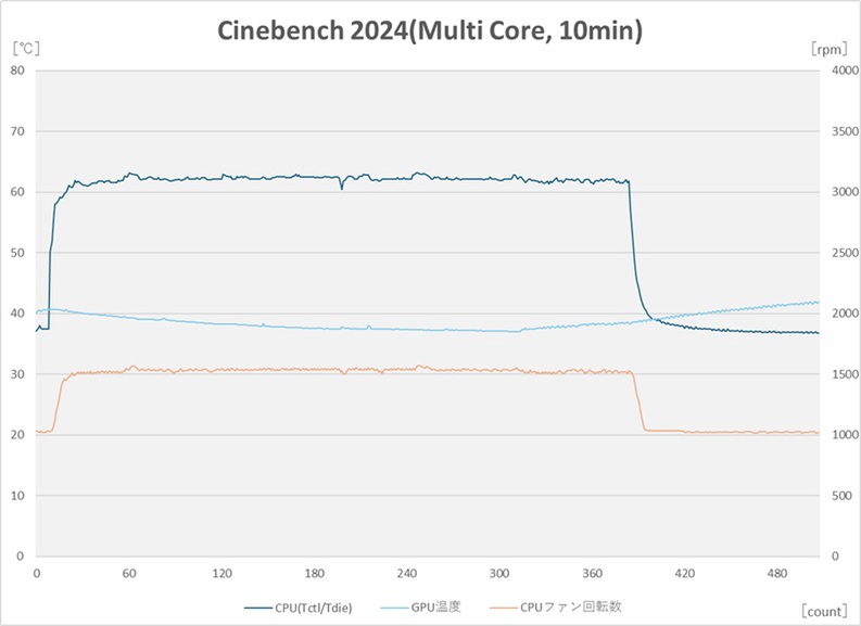 CINEBENCH 2024のMulti Coreテスト。最大温度は63.2℃とそこまで高くはない。そして一旦上昇したあとの温度変化は小さい。長時間のCPU負荷なのでグラフ形状としてはこうなるのが当然予測されるわけだが、TDPが65W程度だとCPUクーラーも全力を出し切るというわけではないようだ。ファン回転数も1600rpmまで達していない。先ほどのPCMark 10と比べれば動作音が大きめに感じるものの、音量変化が小さくうるさい感は感じにくい。