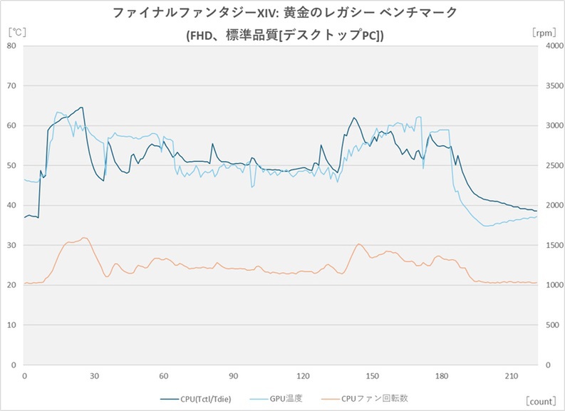 最後にファイナルファンタジーXIV: 黄金のレガシー ベンチマーク。序盤に最大温度が出ており64.6℃。終盤にも60℃を超えたシーンがあるがそれだけで、おおむね50℃台〜60℃未満で推移している。PCMark 10のGamingほどの温度上下はないが、ゲーミングではやはり温度変化が激しめになるということが分かるだろう。もちろんファンの回転数の変化も大きい。ベンチマーク開始後は1200〜1600rpmで、とくに終盤はやや高い1400rpmを挟んだ上下が見られた。
