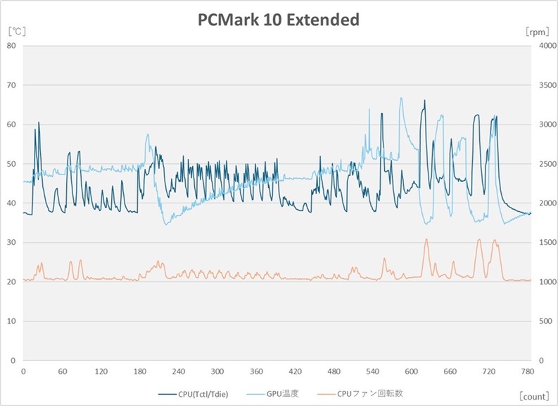 PCMark 10(Extended)。CPU温度は時おり60℃台に入るが、40℃台あるいは50℃前後になるシーンが多い。PCMark 10の4つのシナリオのうち、ホーム用途のEssentialsは40℃前後のシーンも多くて時おり50℃台に乗る程度。ビジネス用途のProductivityは40〜50℃を行き来するくらいで大きく温度上昇することがない。クリエイティブ用途のDigital Content CreationはGPU比率もそこそこあるためCPU温度の底は低めで、ただしCPU比率が高いところでは60℃を超えた時もある。ゲーミング(Gaming)はロードのタイミングで最大温度(66.2℃)を出しているが、GT1とGT2は55℃程度、CPU負荷が高いPhysicsとCombinedに高めの山が出て62℃前後だった。