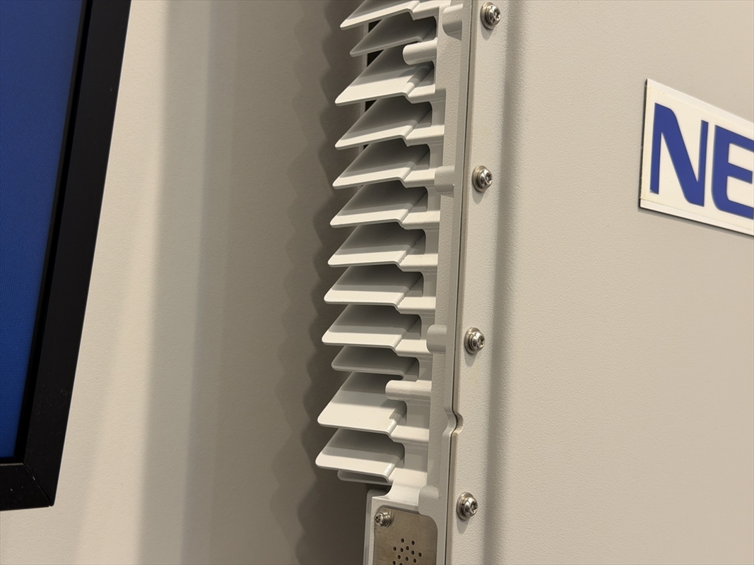 MWC 2026のブースでは、この注力事業を象徴する製品として新型のSub6帯Massive MIMOユニットが展示された。この新型RUは、内部に搭載するパワーアンプモジュール(PAM)を高効率・小型化することで、大幅な低消費電力化と軽量化を実現した。発熱が抑えられるためファンレス設計となっており、背面には熱を下から上へ逃がすためのフィンが備わっている。