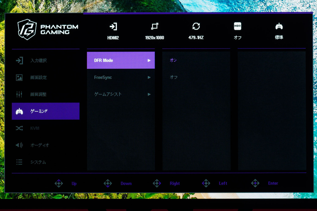 設定の変更またはボタンを押した後は、約6秒ほど画面の切り替わりまで時間がかかる。また、リフレッシュレートは詳細設定から変更する必要があるので、「DFR Mode」を「オン」にした状態で最高の480Hzに設定しておくといいだろう。