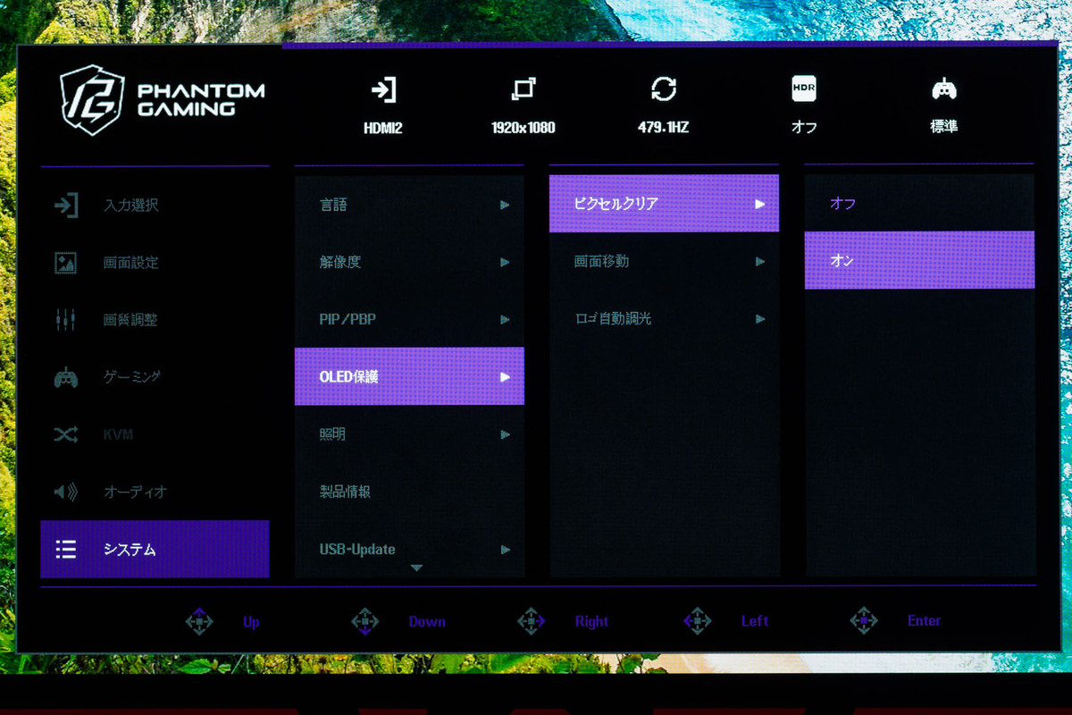 有機ELの焼き付き防止機能はシステムの「OLED保護」にある。ピクセルクリアも実際に試してみたが、説明のとおりオンにするとはい/いいえを問われ、はいを選べば実行、いいえを選べばメニューに戻る。