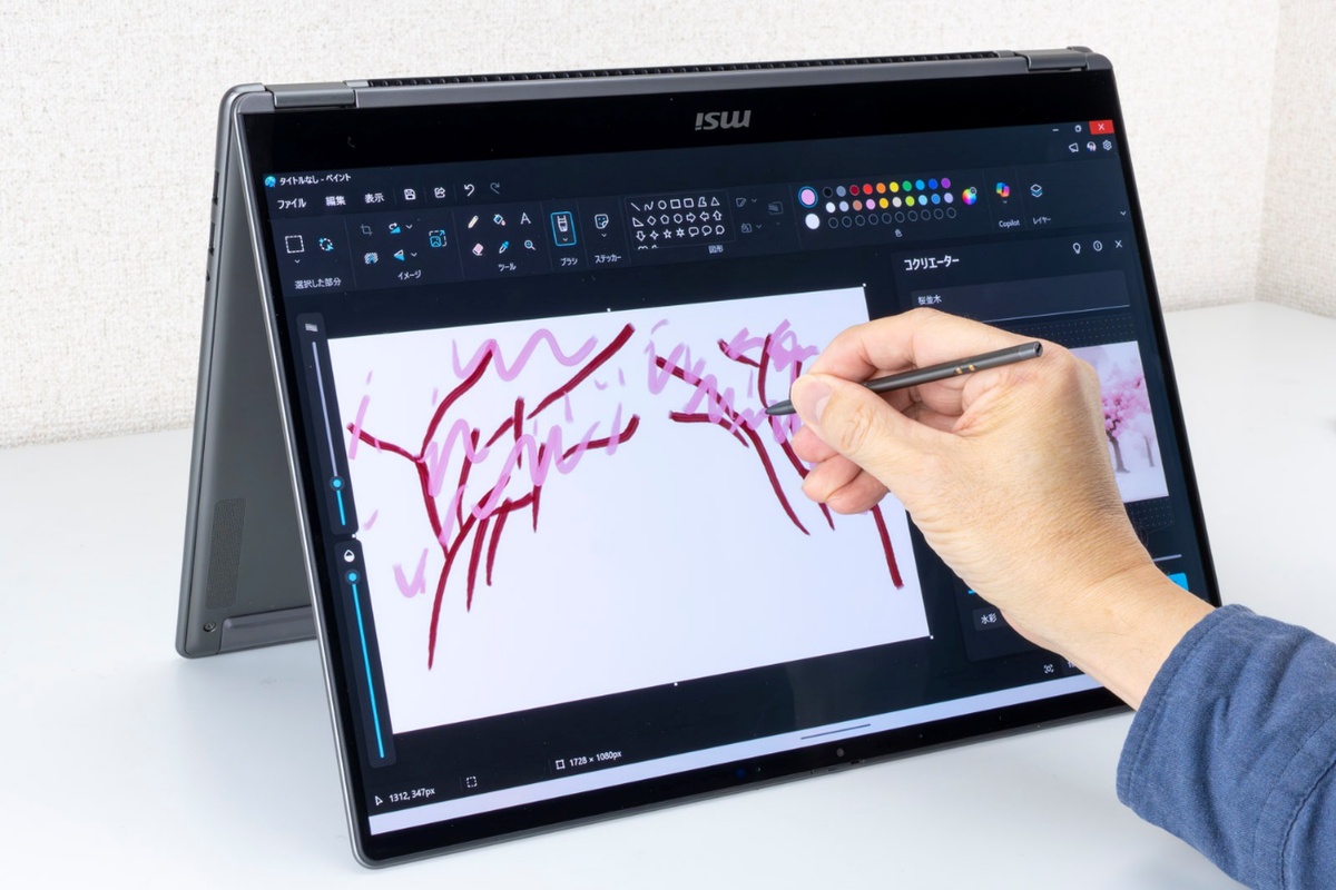 特に、本体裏面にスマートに収納できるアクティブスタイラス「MSI Nano Pen」の存在は大きい。4096段階の筆圧検知に対応し、書き心地はスムーズ。資料への赤入れや、ふとした瞬間のアイデアスケッチなど、アナログとデジタルの境界を意識させない直感的な操作を可能にする。ペンを付属するマシンは他にあれど、このように本体に収納でき、充電もしてくれるタイプは珍しい。持ち運び時にも忘れないし、いつでも活用できる。