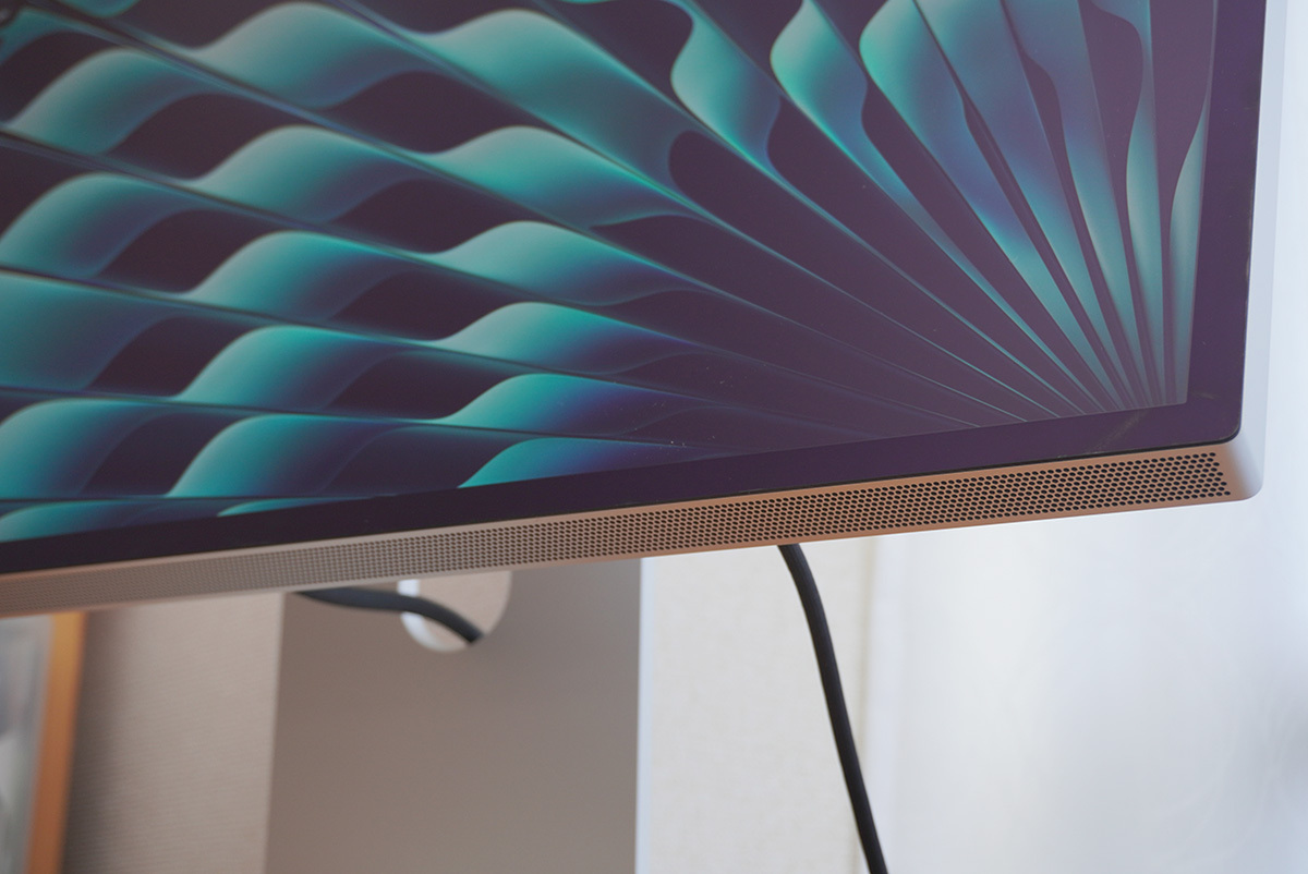 やはりアップル純正ディスプレーの最大の魅力は、画質の安定感が優れていることです。27インチの5K Retina XDRディスプレーは解像度が高く色再現性に富んでいます。ピーク輝度が2000ニトに到達するHDR映像表示の明るさ、暗部階調はムラがなく、色域の広さは4K/HDRの映像コンテンツを表示すると抜群の臨場感を楽しませてくれます。ベゼルに下向きに配置したスピーカーシステムにより、包み込まれるような空間オーディオも再現します。
