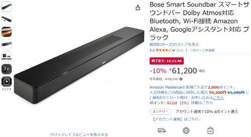 Boseのサウンドバー「Bose Smart Soundbar」がAmazonタイムセール対象。参考価格68,000円のところ、10%オフの61,200円で販売中。
