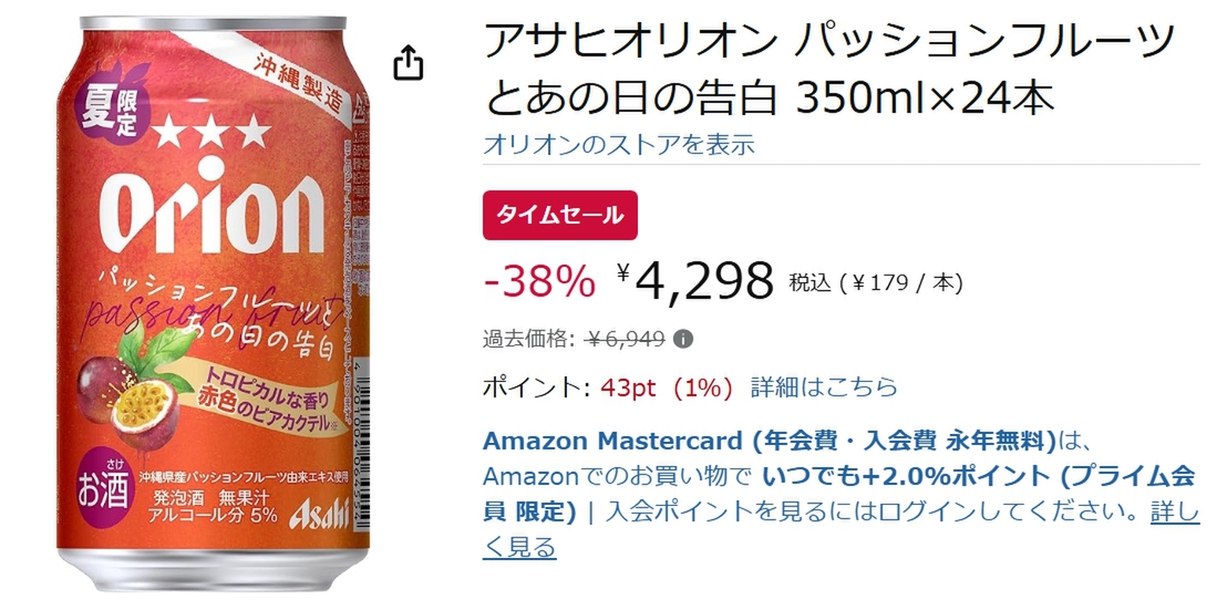沖縄県産パッションフルーツ由来エキスを使ったビアカクテル「アサヒオリオン パッションフルーツとあの日の告白 350ml×24本」が、現在開催中のAmazonタイムセールで38%オフの4,298円になっています。