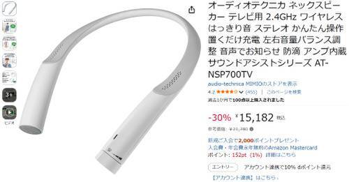 オーディオテクニカのネックスピーカー「AT-NSP700TV」がAmazonで割引対象。参考価格21,780円のところ、30%オフの15,182円で販売中。