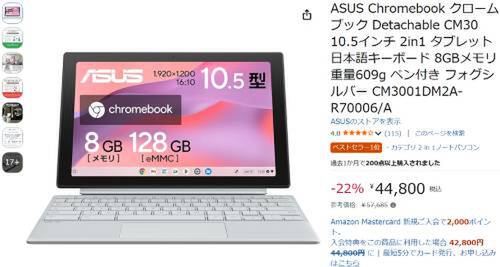 ASUSの2in1 Chromebook「CM30 Detachable」がAmazonで割引対象。参考価格57,685円のところ、22%オフの44,800円で販売中。