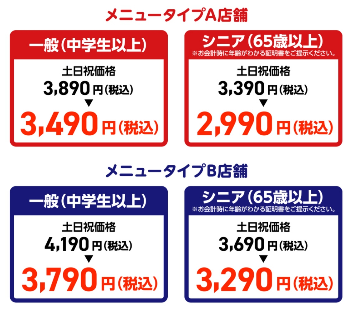 食べ放題は店舗によりメニュータイプが2種あり、料金も異なりますが、3890円の場合3490円に、4190円の場合3790円になります(土日祝日価格)。