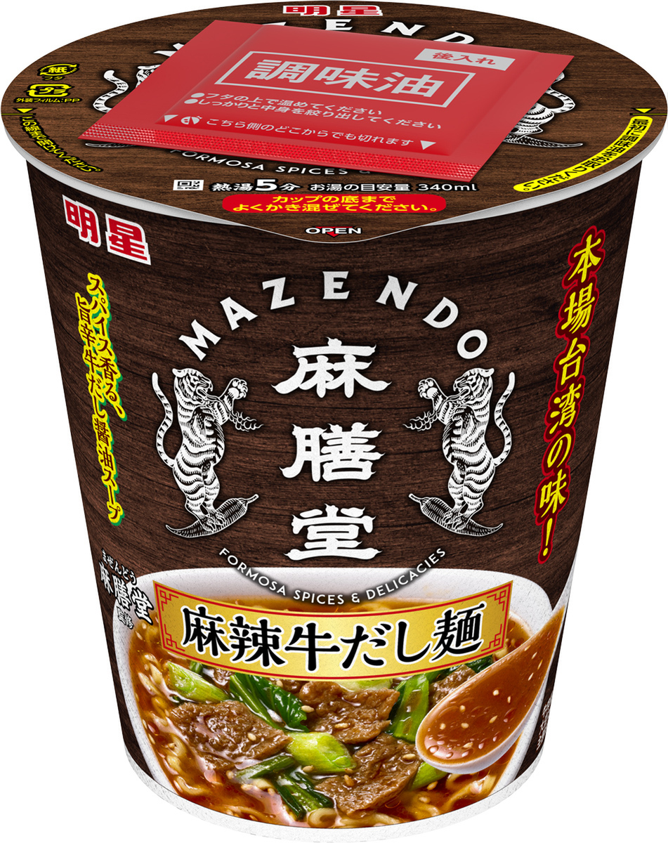 「明星 麻膳堂監修 麻辣牛だし麺」は、麻膳堂の看板メニュー「麻辣牛肉麺」をイメージして開発。牛の旨みと麻辣の辛みを組み合わせたスープが特徴とされています。