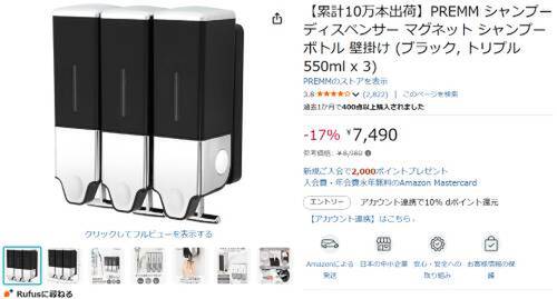 PREMMのマグネット式シャンプーディスペンサー(トリプル 550ml×3)がAmazonで割引対象。参考価格8,980円のところ、17%オフの7,490円で販売中。