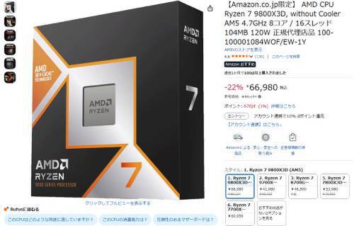 AMDのデスクトップCPU「Ryzen 7 9800X3D」がAmazonで割引対象。参考価格86,134円のところ、22%オフの66,980円で販売中。