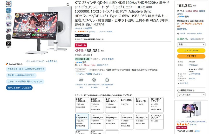 Amazon.co.jpにて、KTCの27型ゲーミングディスプレー「M27P6」が販売中だ。参考価格は8万9980円だが、タイムセールにより24%オフの6万8381円で購入できる(3月17日時点)。