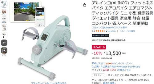 アルインコのフィットネスバイクがAmazonタイムセール対象。過去価格15,004円のところ、10%オフの13,500円で販売中。