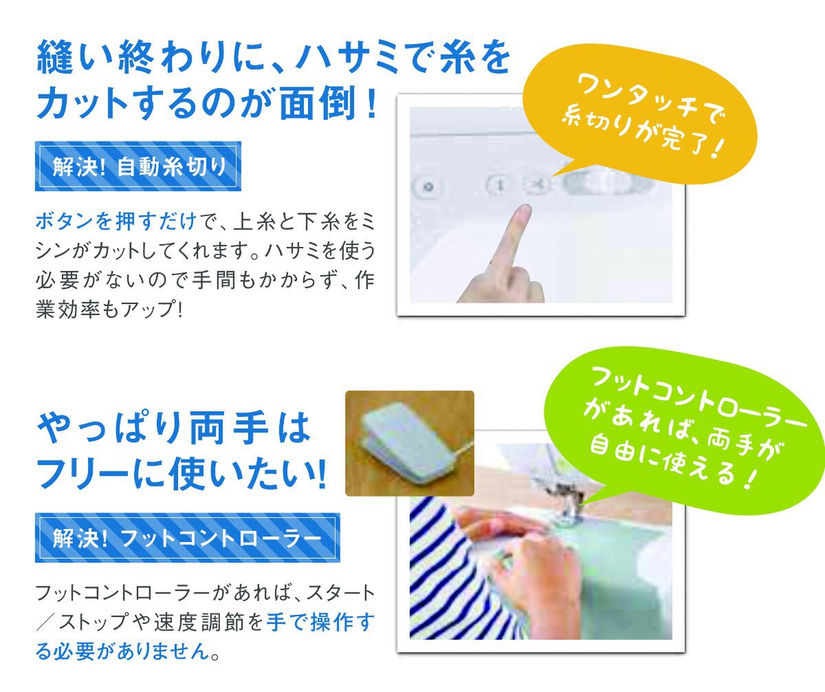 新設計の「押さえ」や「送り歯」を採用し、デニムなどの固くて厚手の生地や段縫いの箇所でも感動のぬいごごちを実現している。
