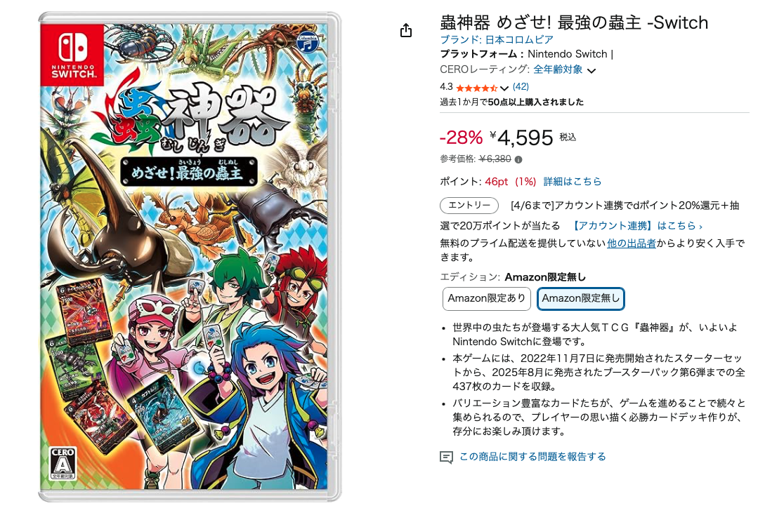 さて、今回紹介するのは「蟲神器 めざせ! 最強の蟲主」です。Amazonでの参考価格は6,380円ですが、28%オフの4,595円で購入できます(3月17日現在)。