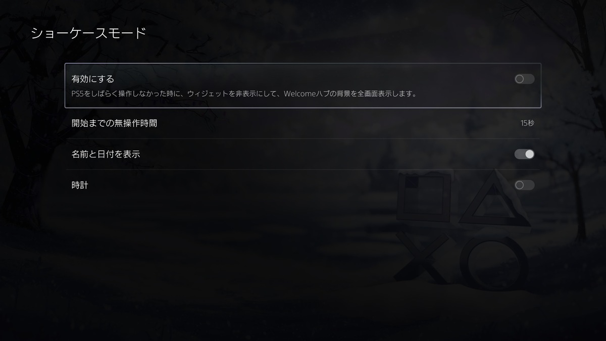 設定方法は、Welcomeハブに行って△ボタンを押し、右上のメニューへ。すると設定のなかに「ショーケースモード」と「スライドショー」が新たに追加されている。デフォルトはオフなので、希望する場合はオンに変えよう。