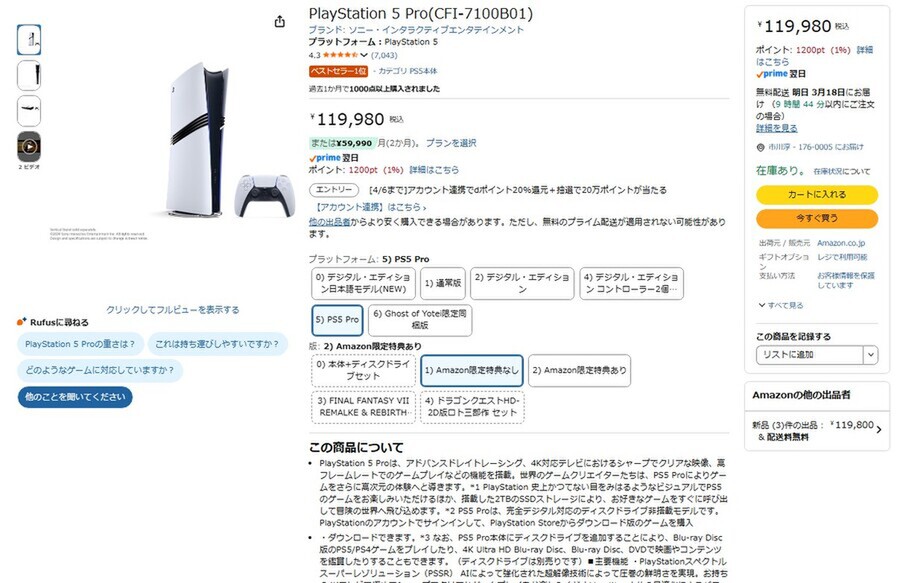 Amazon.co.jpにて、「PlayStation 5 Pro」が販売中だ。価格は11万9980円。今後発売されるビッグタイトルを快適に遊びたい人におすすめだ。